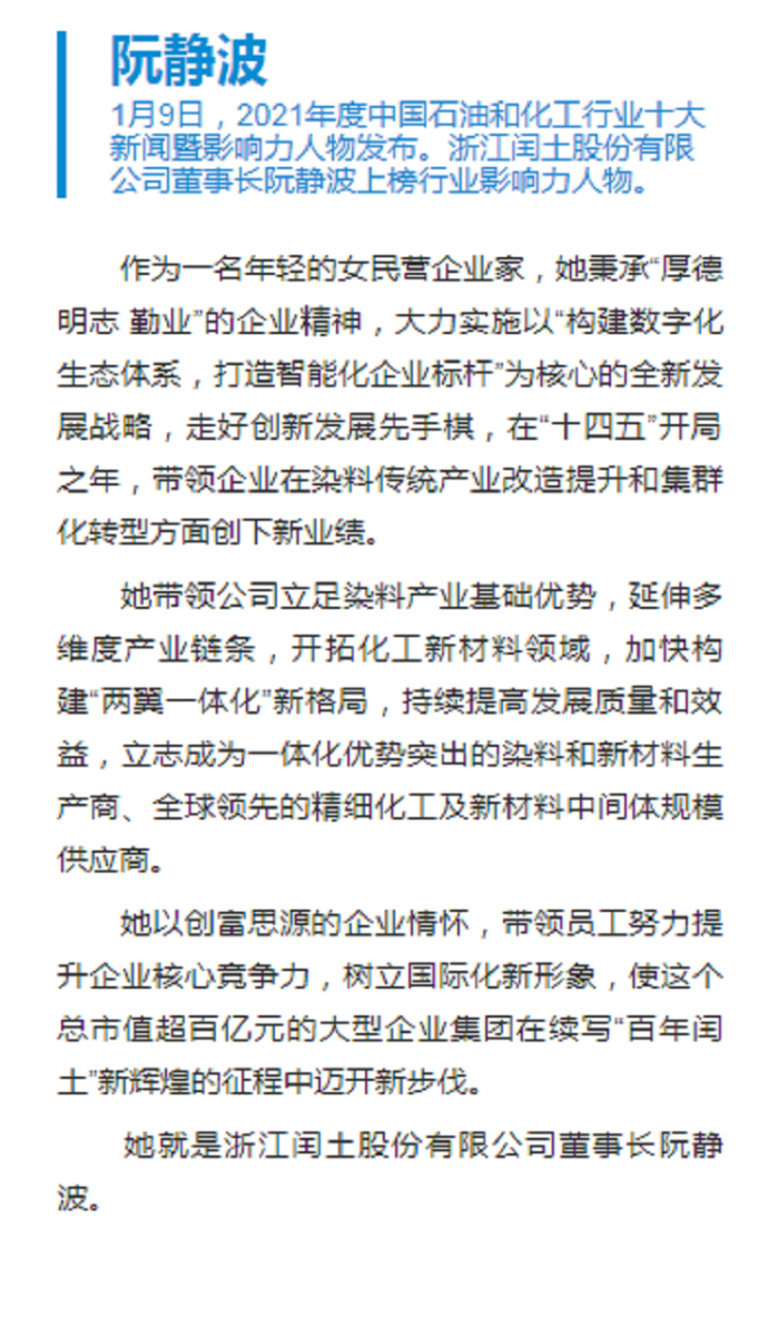 2022年1月9日,由中國石油和化學(xué)工業(yè)聯(lián)合會指導(dǎo),《中國化工報》社有限公司主辦的“2021年度石油和化工行業(yè)十大新聞暨影響力人物發(fā)布盛典”采用線上直播的形式舉行。浙江閏土股份董事長阮靜波榮膺“2021年度中國石油和化工行業(yè)影響力人物”。